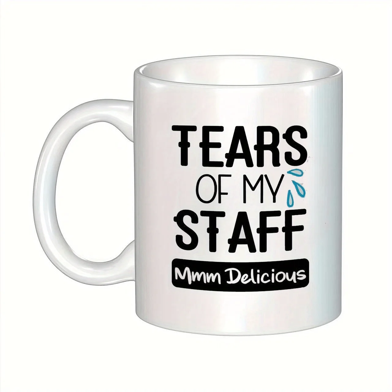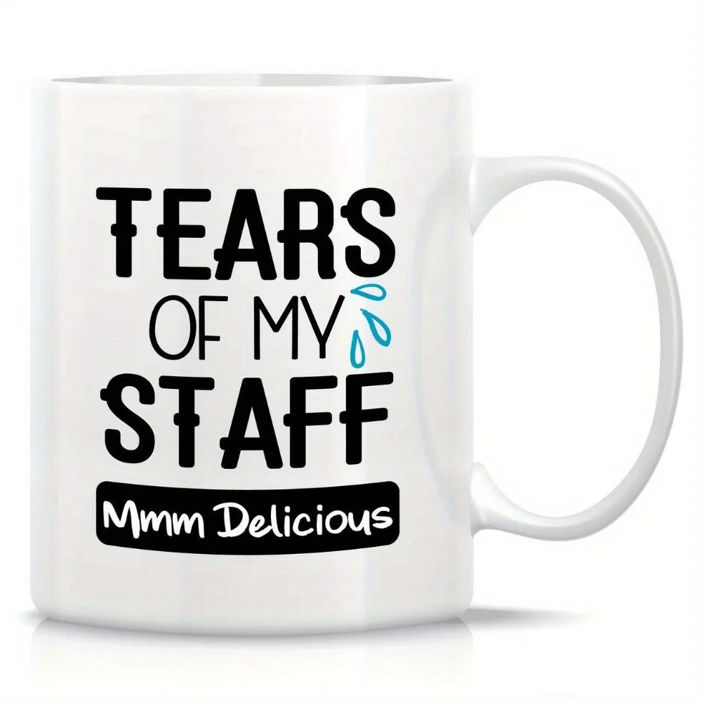 1 Funny Mug - "Tears of My Staff Delicious" humorous coffee mug, white with black text, dishwasher safe insulated for hot drinks