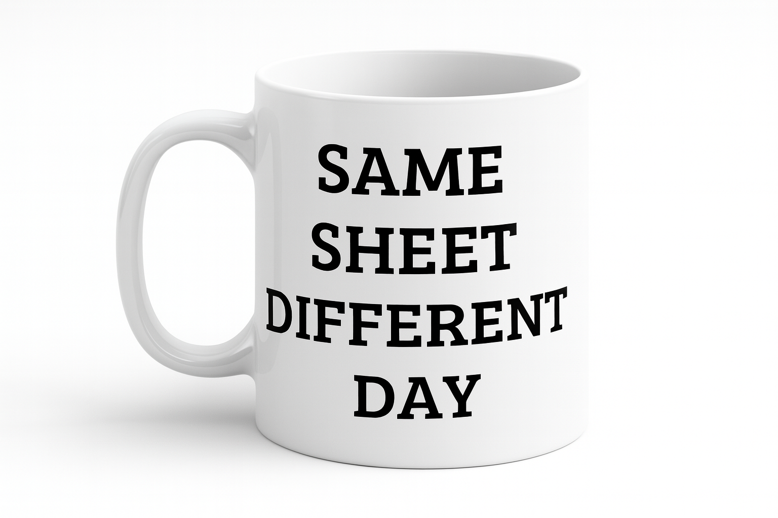 ☕ Funny Coffee Mug – "Same Sheet Different Day" | Sarcastic & Office Humor Gift